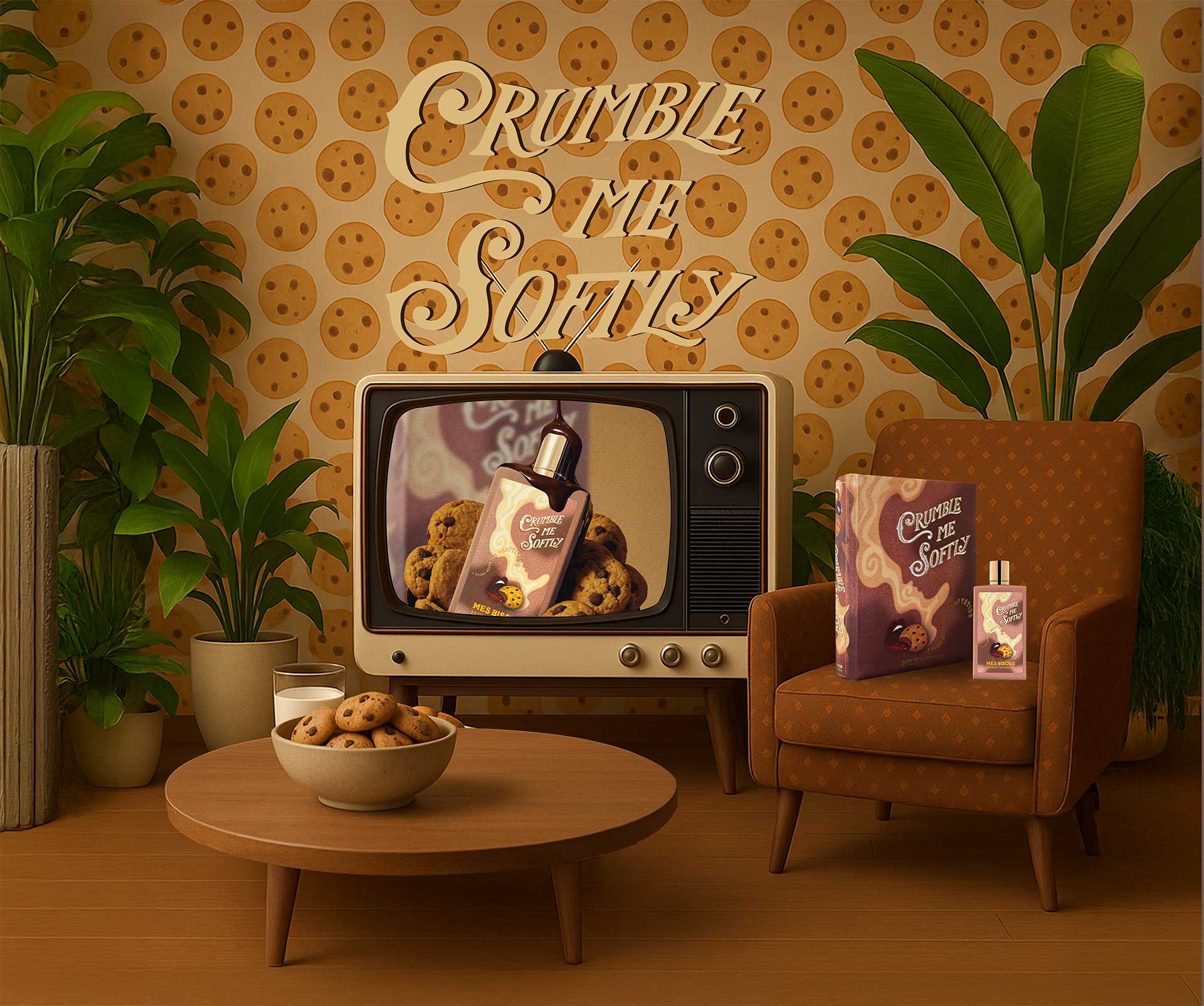 The warm, sweet, and dangerously comforting notes of freshly baked chocolate chip cookies and rich caramel is how Crumble Me Softly makes its presence feel. A surprise awaits at the heart; the spiced charm of nutmeg and saffron, balanced by the softness of lavender, revealing something that makes one curious. As it lingers, an invitation to temptation presents itself. With amber, patchouli, smoky oud, cypriol, and mossy undertones, a craving dressed in layers embodies, leaving one craving for more.